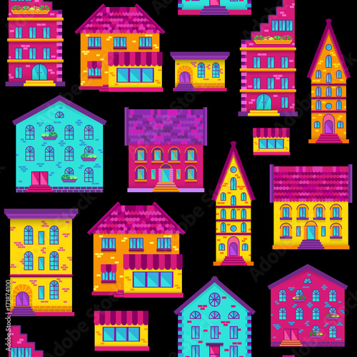 Bright Colored Seamless House Pattern On Black Background Doodle