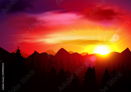 Mountain Sunset Landscape Realistic Pine Forest And Mountain