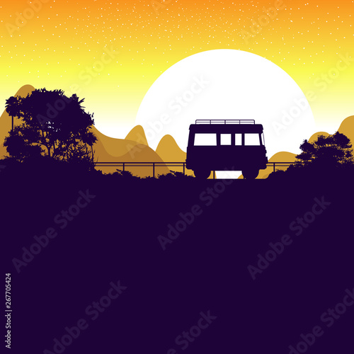 Drive A Van Road Background Sunset Silhouettes On The Mountain And