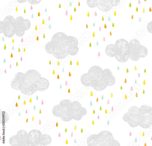 Vector Kids Pattern With Clouds And Rain Drops Cute Doodle