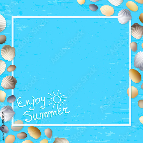 Shells Frame Enjoy Summer Blue Grunge Background Stones And