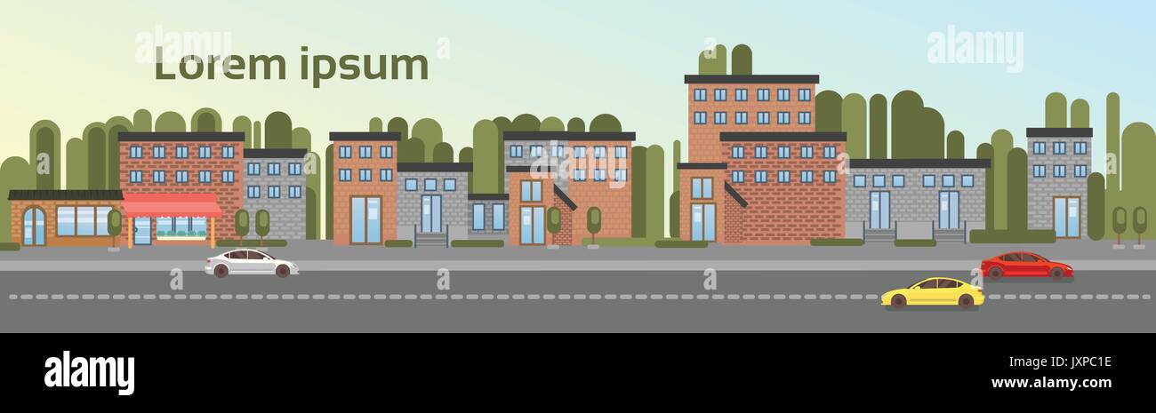 Background Of Modern City With A Car On A Road Vector Flat Design