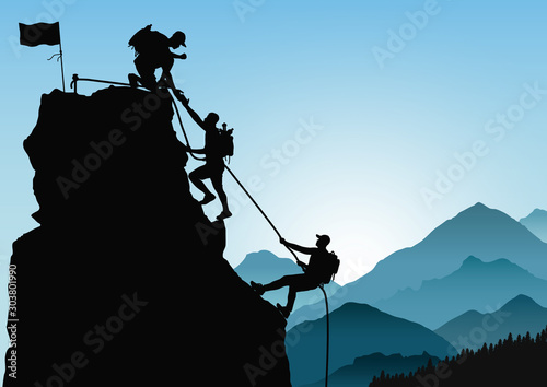 Silhouette Of Three Men Climbing Mountain By Helping Each Other On