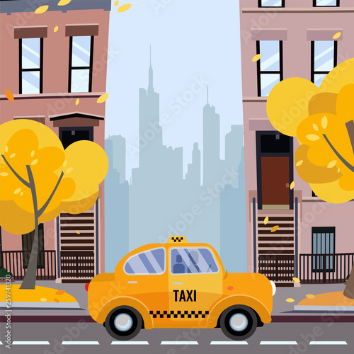 America City Street Urban Landscape Cozy Yellow Taxi On New York