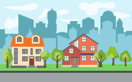 Vector City With Two Two Story Cartoon Houses And Green Trees