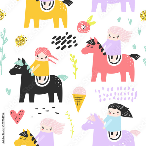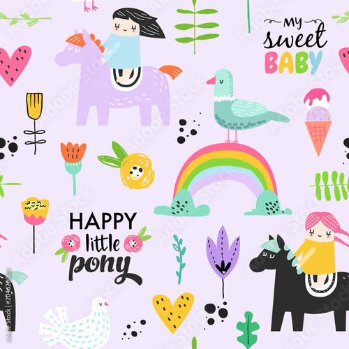 Childish Seamless Pattern With Cute Girls And Pony Creative Kids