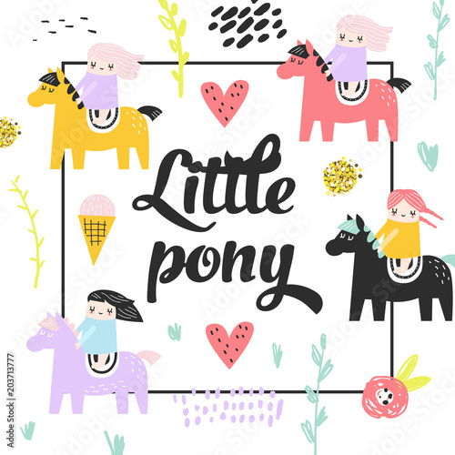 Childish Design With Cute Girls And Pony Creative Kids Background