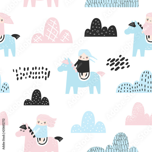 Childish Seamless Pattern With Cute Girls Clouds And Pony