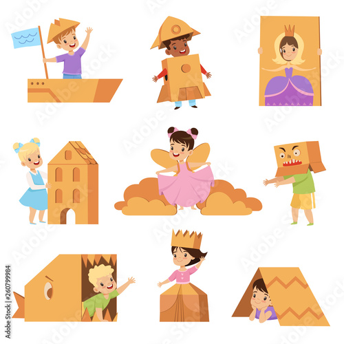 Cute Creative Kids Playing Toys And Costumes Made Of Cardboard