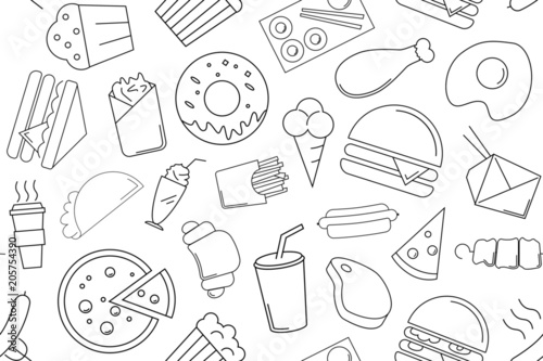 Fast Food Decorative Seamless Pattern Hand Drawn Vector Fast Food Background In Line Art Style