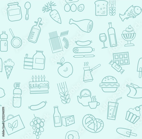 Food Seamless Pattern Light Blue Contour Grocery Store Vector Food