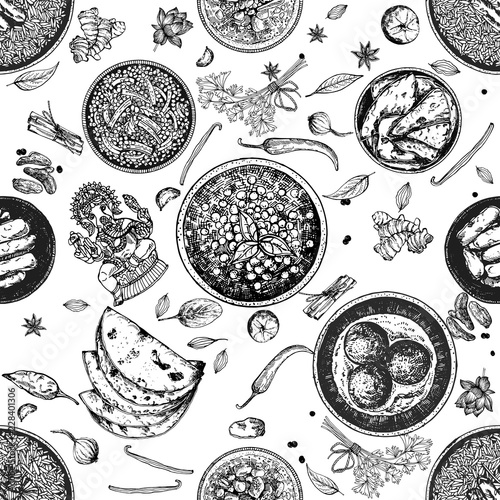 Seamless Pattern Of Hand Drawn Sketch Style Indian Food And